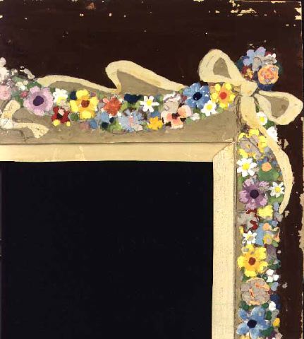 - En vinkel och delen av en brun ram (inramning) med blomstergirlanger i olika pastellfärger mot grå botten med rosett och band i ljusgrått. Innerkanten är delvis pålimmad och går att vika.