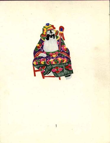 - Kinesisk mansfigur med mask och helskägg iklädd gul mössa med färgrikt mönster, grön-lila rock med rosa och gula blommor, röd "spira" på höger sida, sittande på en röd stol.