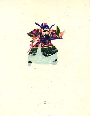 - Kinesisk mansfigur med mask och svart skägg iklädd blå huvudbonad med öronlappar, lila rock med rosa och gröna blommönster och kanter, ljusgrön kjol, han håller ett blått svärd i högerhanden.