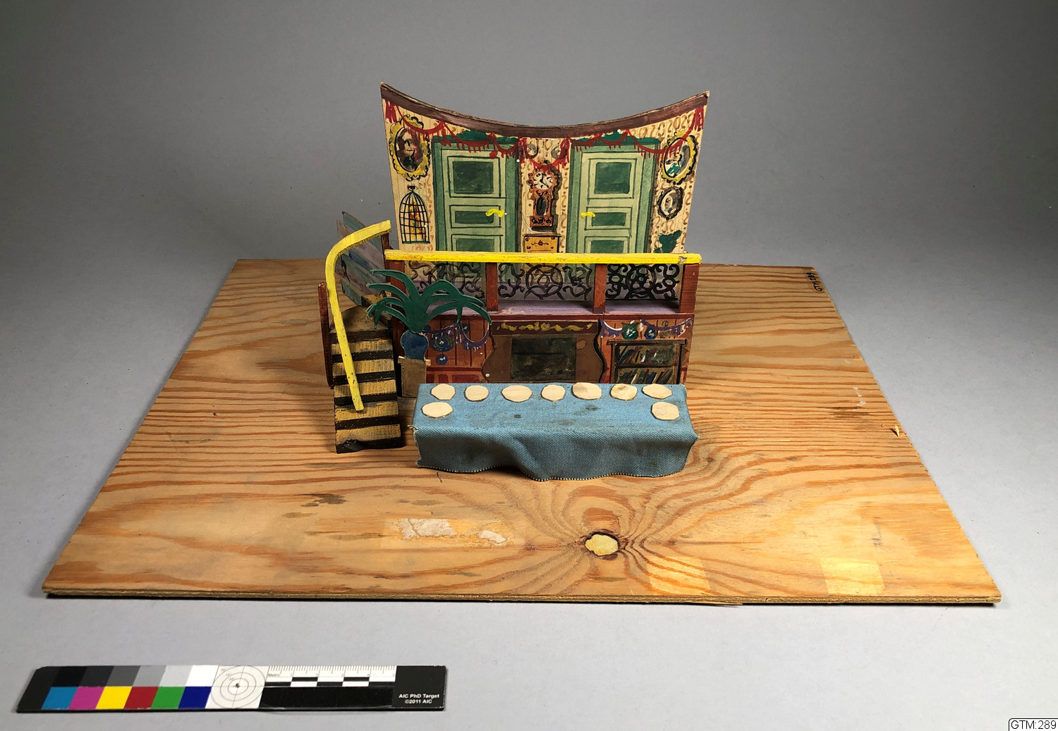 - Mitt på scenen ett dukat bord med blå duk, t v därom en trappa som leder upp till en avsats med smidesräcke, väggen bakom med tavlor och klocka har två gröna dörrar, en palm är placerad nedanför trappen. Baksidan av scenmodellen är målad i starka färger på gul botten. Ev. tänkt för cirkusscenen (?)