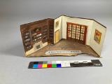 - Rummet har t v en brun bokhylla efter hela väggen med en låg öppen spis i mitten, t h därom, mot mitten, en vaderad gul dörr, t h en vägg med fyrdelat, smårutigt fönster (eller altandörr ?), längst ut t h en tavla, väggarna är ljust gulgröna, golvet brunbeige, parkettmönstrat.