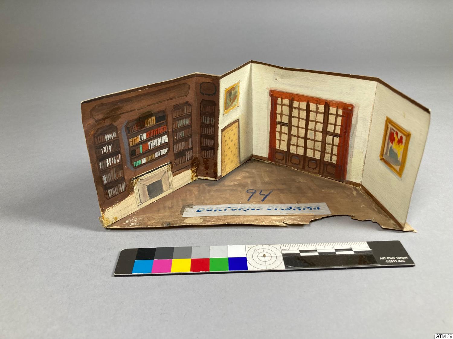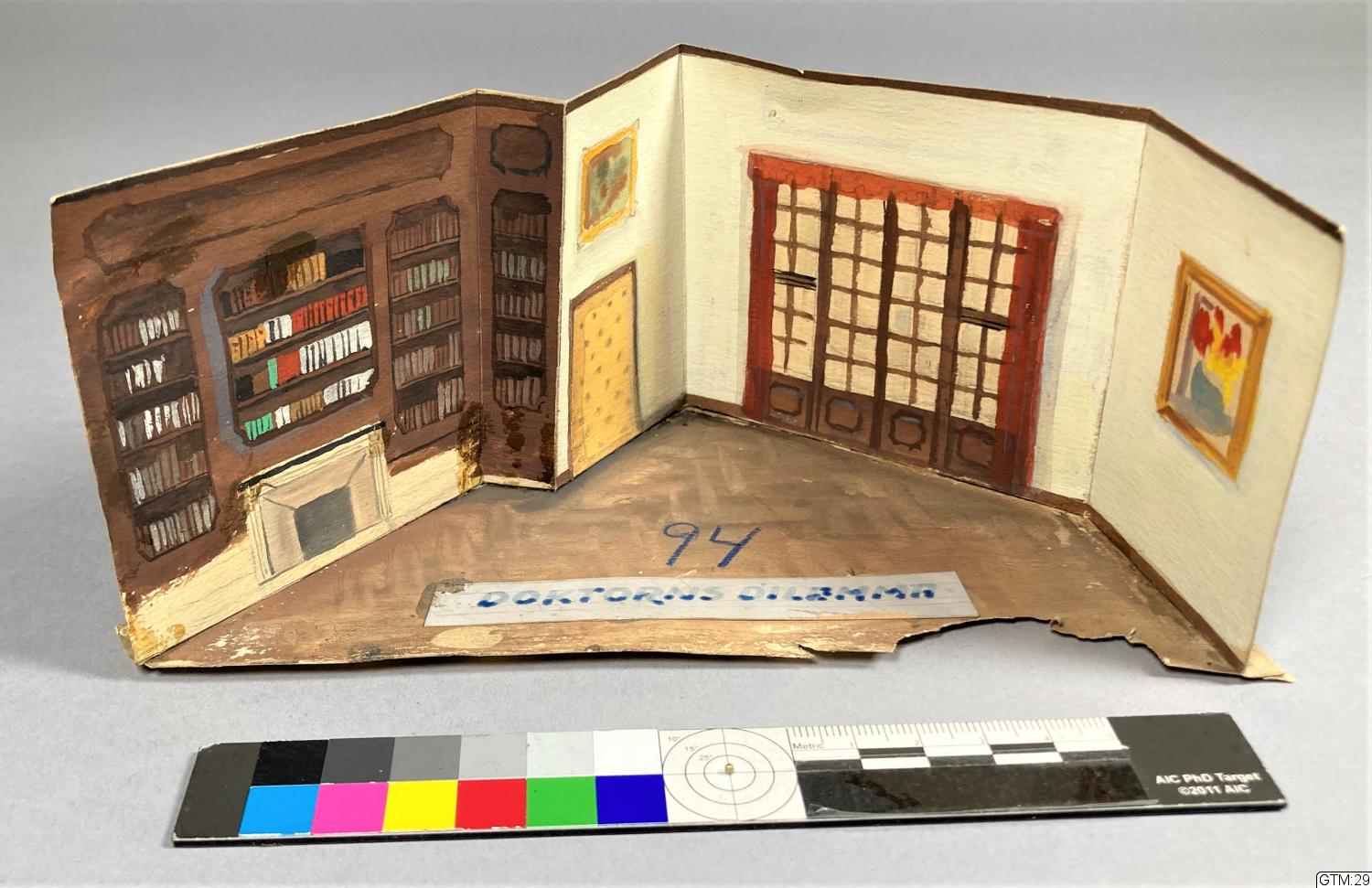 vikte dek.delar i papper limmade på tunn grundplatta i kartong.; Rummet har t v en brun bokhylla efter hela väggen med en låg öppen spis i mitten, t h därom, mot mitten, en vaderad gul dörr, t h en vägg med fyrdelat, smårutigt fönster (eller altandörr ?), längst ut t h en tavla, väggarna är ljust gulgröna, golvet brunbeige, parkettmönstrat.