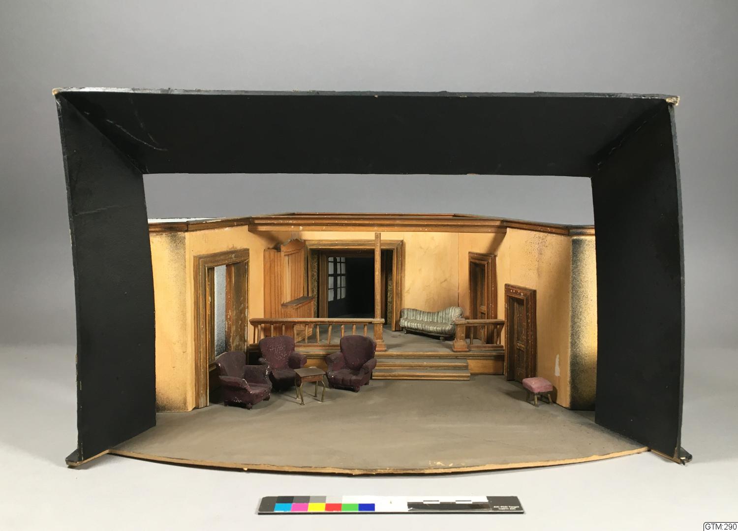 - Svart proscenium, brunt golv som i mitten av scenen har en trappavsats med balustrad, en dörr till höger och i hörnet innanför står en grönrandig kanapé, ett skåp på vänster sida, bred dörröppning till bakomvarande rum med mönstrade tapeter och ett fönster, t v nedanför avsatsen står tre lila fåtöljer framför fönstret, på höger sida en dörr, gulrandiga tapeter i hela främre rummet.