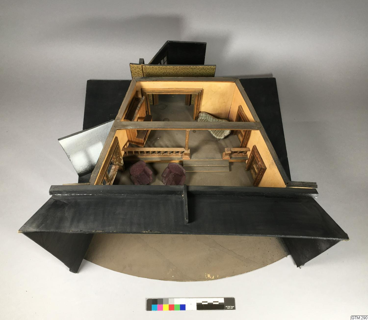 - dek delar av papper och trä limmade på och mot varandra och på grundplatta av kartong, prosceniet med hjälp av nubb.