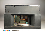 scenmodell, scenografi, tittskåpsmodell [med belysning], vridscen [två scenbilder]