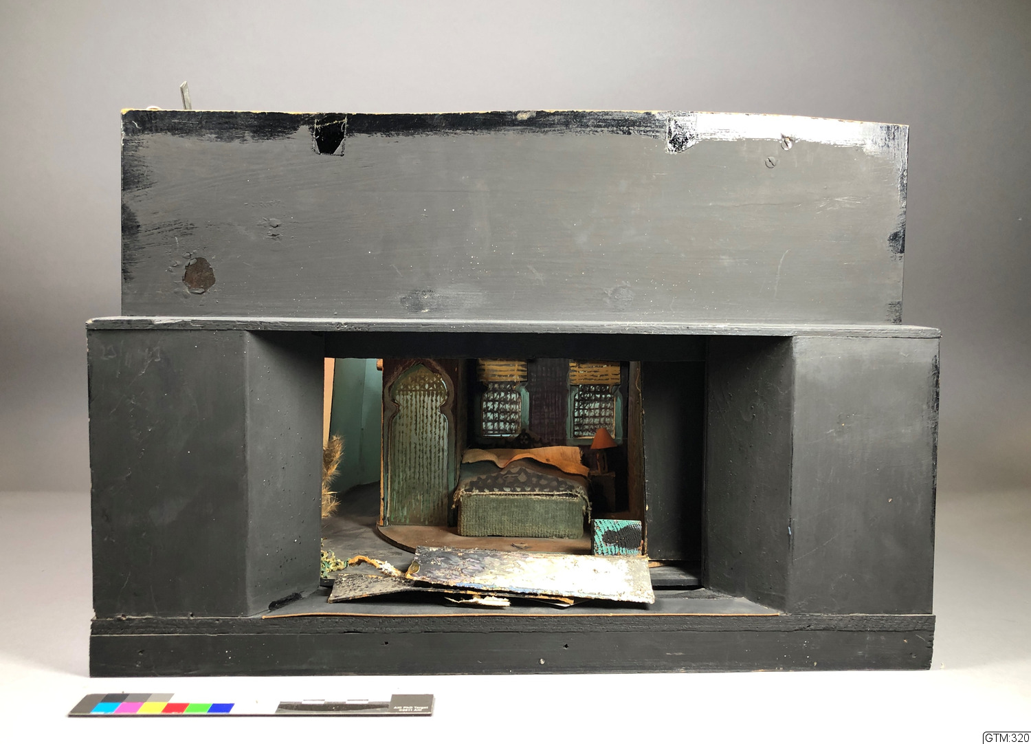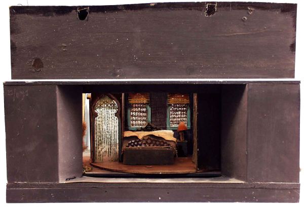 - Modellen är inmonterad, men står lös i tittskåpslådan, som är svart med nermonterad belysning, saknar sidor och lock. bild _a: exteriör med pålar som håller upp ett grästak framför en grårappad fasad med två fönster, palm på sidorna. bild _b: interiör av fasaden, ett rum med en stor säng framför de två fönstren, på vänster sida dörr med pärlförhänge, t h ett nattduksbord med lampa, t h dörröppning med draperi, blå fond framför rosa rundhorisont.