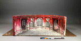 - dek delar i trä och papper är limmade på grundplatta i masonit, snören och gips har formats till utsmyckningarna i dekoren, tunn kartong till dörr- och fönstersröjs.