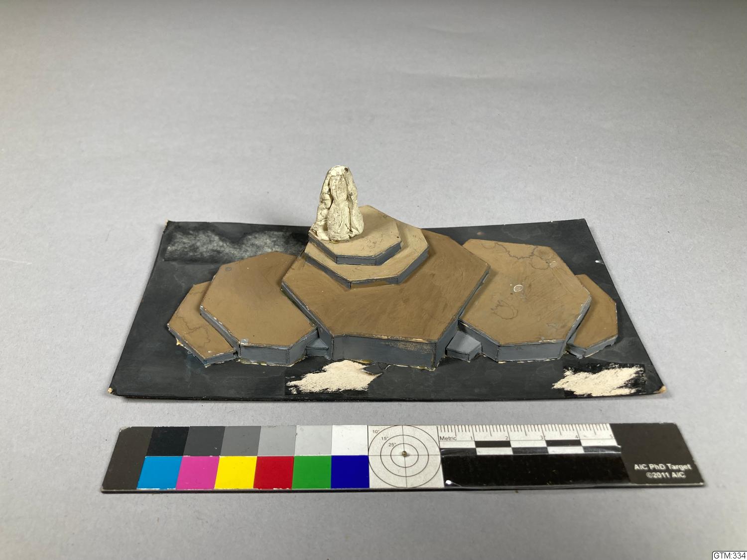 - Scenmodell av Ingvar Danielsson, från Folkteaterns uppsättning av "Lea och Rakel" 1959. Brunbeige och grå trappavsatser i olika former och storlekar leder upp till en figur i vitt. dek delar av papper limmade på och mot varandra och på grundplatta av papper, figuren formad av modell-lera och fastlimmad.