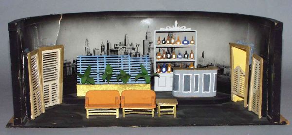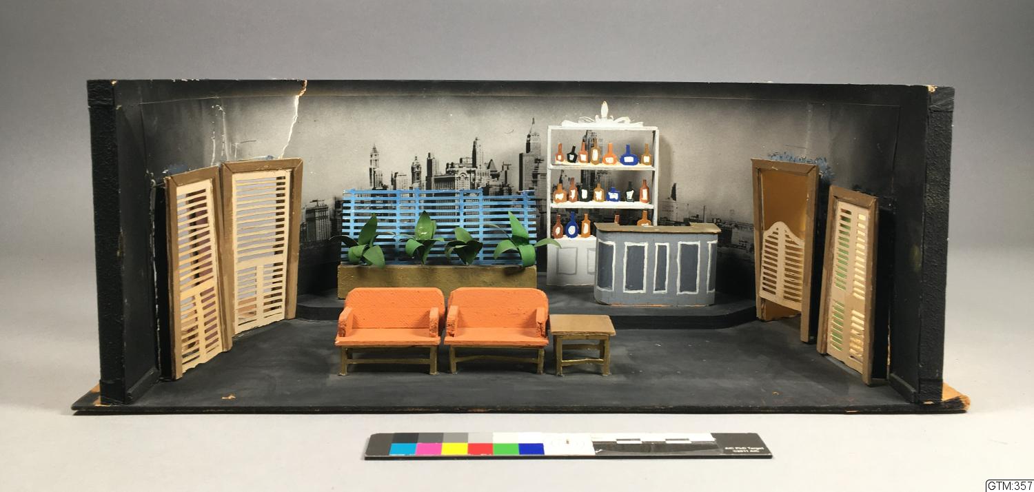 dek delar av trä och papper limmade på grundplatta av tunn masonit.; Halvcirkelformat rum med gråsvarta väggar och fond med utsikt över New York, på vänster sida två fönster med jalusier, på höger sida ett fönster och en dörr med jalusier, en avsats upp mot fonden med gröns växter framför en blå spaljé , t h därom ett barskåp och bardisk, längst fram på scenen två orange soffor intill varandra med ett bord på höger sida om dem, svart golv.