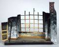 - Rum där fonfväggen har stort ateljéfönster, på vänster sida en halvöppen dörr, på höger sida ett rör upp efter väggen till en skorstensmur, väggarna är grå-svarta, golvet gråbrunt med brädmönster.