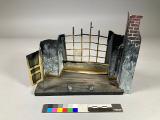 - dek delar av papper limmade på grundplatta i trä, kaminröret av ståltråd med modell-lera formad runt om.
