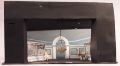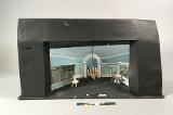 dek delar och detaljer av papper (speglar av pålimmad folie) limmade på grundplatta av kartong, proscenium och horisont med hjälp av små träklossar som stöd, takkronan monterad på ståltråd och tejpad på prosceniekappan.