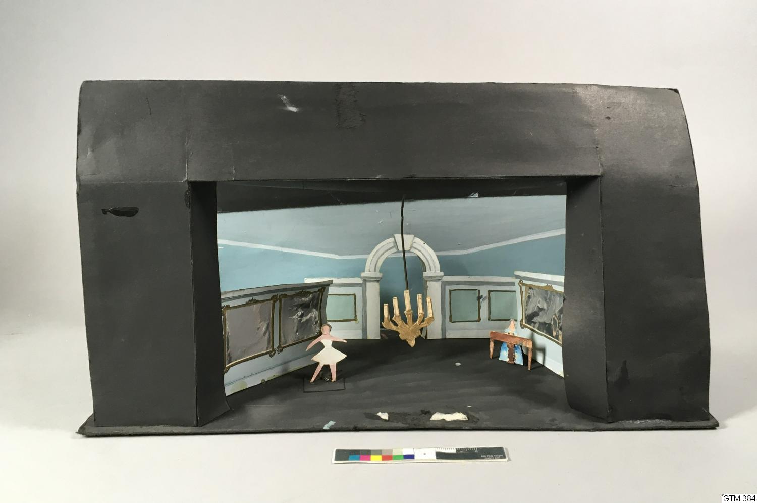Svart proscenium och golv. På båda sidor ljusblå väggar med stora speglar, fondväggen har en portal i mitten, ljusgröna väggfält och ljusblå paneler, horisont i blått och svart, takkrona i mitten, en dasör till vänster och i bakgrunden en kvinna vid flygel.; dek delar och detaljer av papper (speglar av pålimmad folie) limmade på grundplatta av kartong, proscenium och horisont med hjälp av små träklossar som stöd, takkronan monterad på ståltråd och tejpad på prosceniekappan.