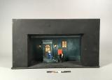 dek delar och detaljer limmade på och mot varandra och på grundplatta av kartong, prosceniet med hjälp av små träklossar som stöd samt ihoplimmade så att modellen är sluten upptill.