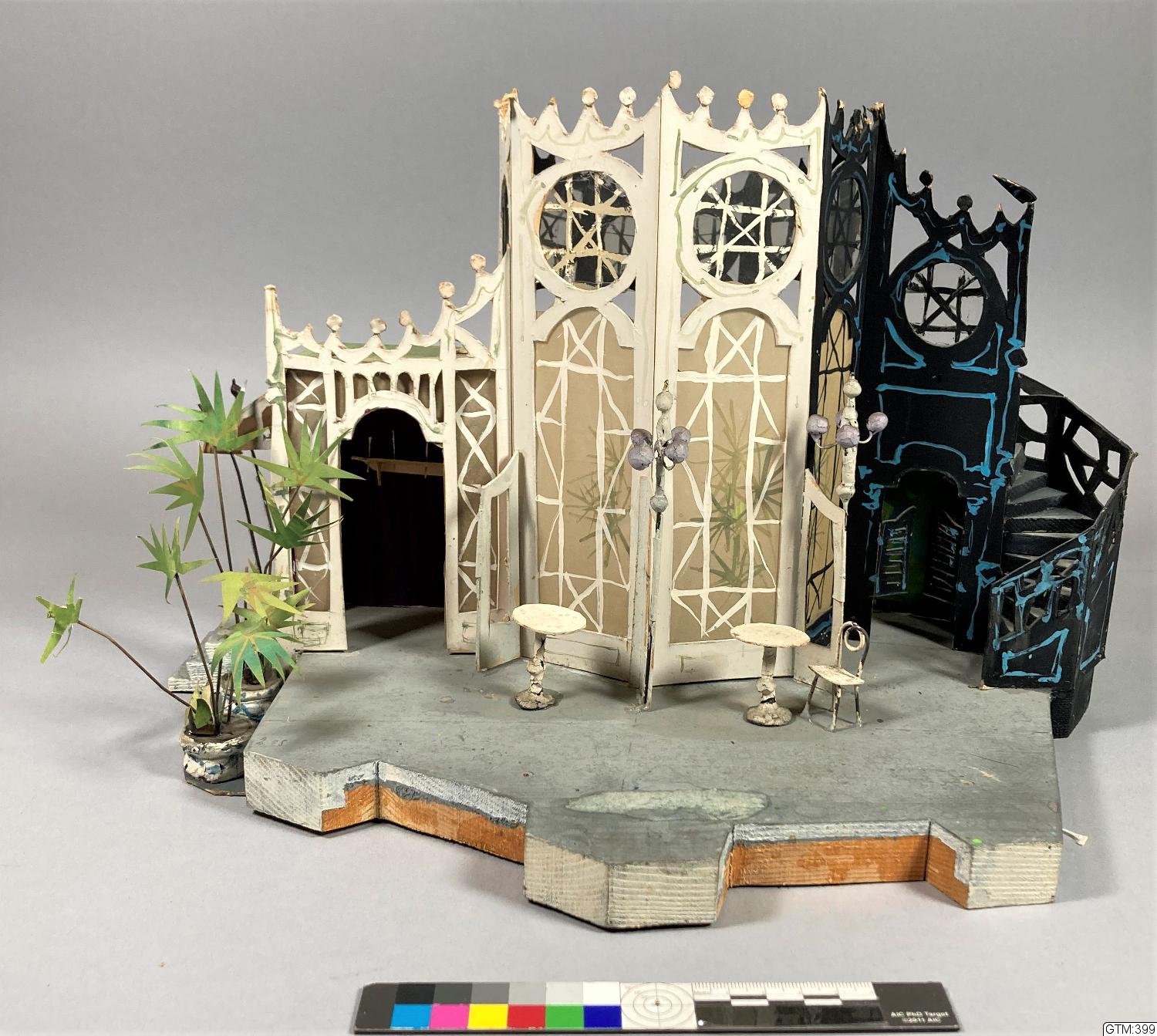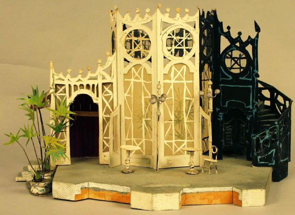Vit paviljong (?) i mitten med glasdörrar och fönster, på vänster sida en utbyggnad med en dörröppning, palmer i krukor t v därom, på höger sida av paviljongen en svart utbyggnad med dörröppning och en spiraltrappa på utsidan, allt rikt utsmyckat på tak och balustrader, framför paviljongen två små runda bord med stolar, två dekorativa lyktstolpar med flera kupor, ljusgrått scengolv.; dek delar av papper, plast, trä och ståltrådskonstruktioner är limmade i, på och mot varandra och på grundplattan av trä (c:a 2 cm tjock).