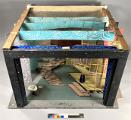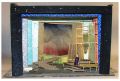 - proscenium och stativ på båda sidor och baktill av trä spikade mot varandra och limmade på grundplatta av masonit, dek delar och detaljer av papper och trä är limmade på och mot varandra och mot scengolv och grundplatta, sidostycken tejpade på ribbor i "taket" samt fästa med sytråd.