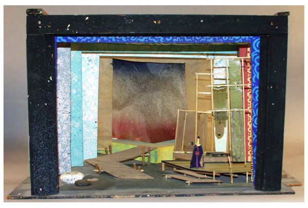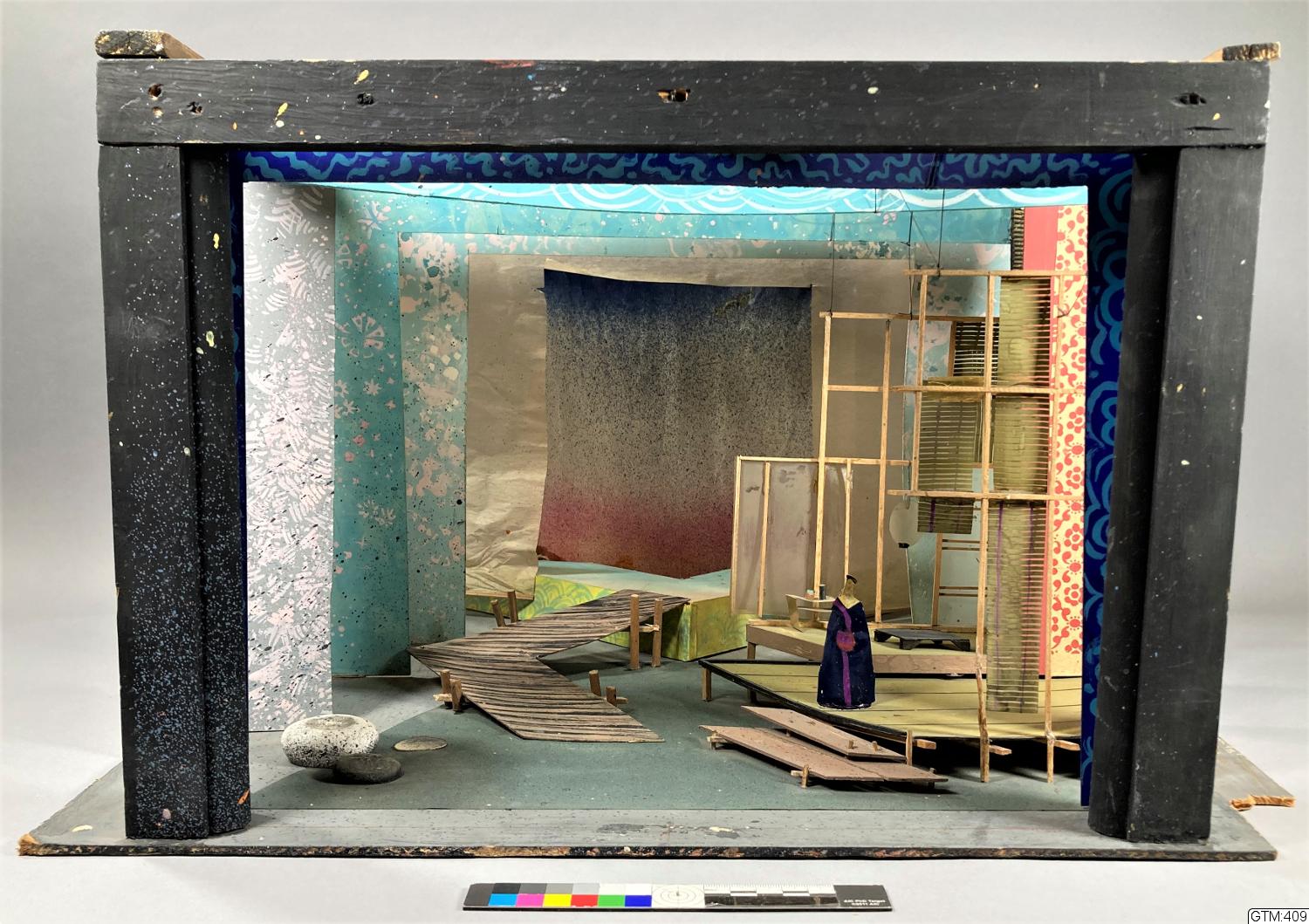 - Svart proscenium, ljusgrå grundplatta, pålimmat svagt grönt scengolv, på höger sida uppbyggda trappor och avsatser av breda bräder, japanska fönsterväggar. en figur står till höger, på vänster sida stora stenar, från mitten går en vinklad brygga (spång) upp till en högre vinklad avsats, sättstycken på båda sidor, en del mönstrade, en del i ljusa pastellfärger, horisonten är rödflammig.