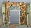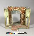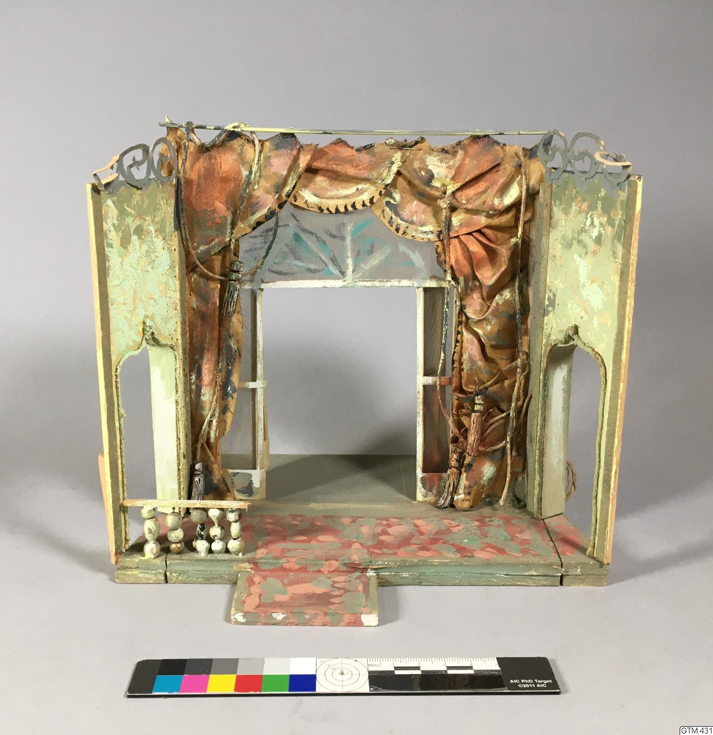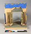 Litet trappsteg upp till avsats med glasvägg och dörröppning där båda dörrarna står vidöppna, dekorativ drapering i pastellfärger runt om och med guldsnören och tofsar, smala sidoväggar med kölbågeportal, balustrad på vänster sida, rosa matta på golvet, dekoren i övrigt i ljusgröna nyanser.; dekoren av balsaträ, schiffong och papper limmade på och mot varandra och på den exakt för scenbilden utskurna grundplattan av två lager balsaträ, gardinera häftade och limmade och monterade med hjälp av ståltråd, tofsar av formad modellera, glasrutor av schiffong.