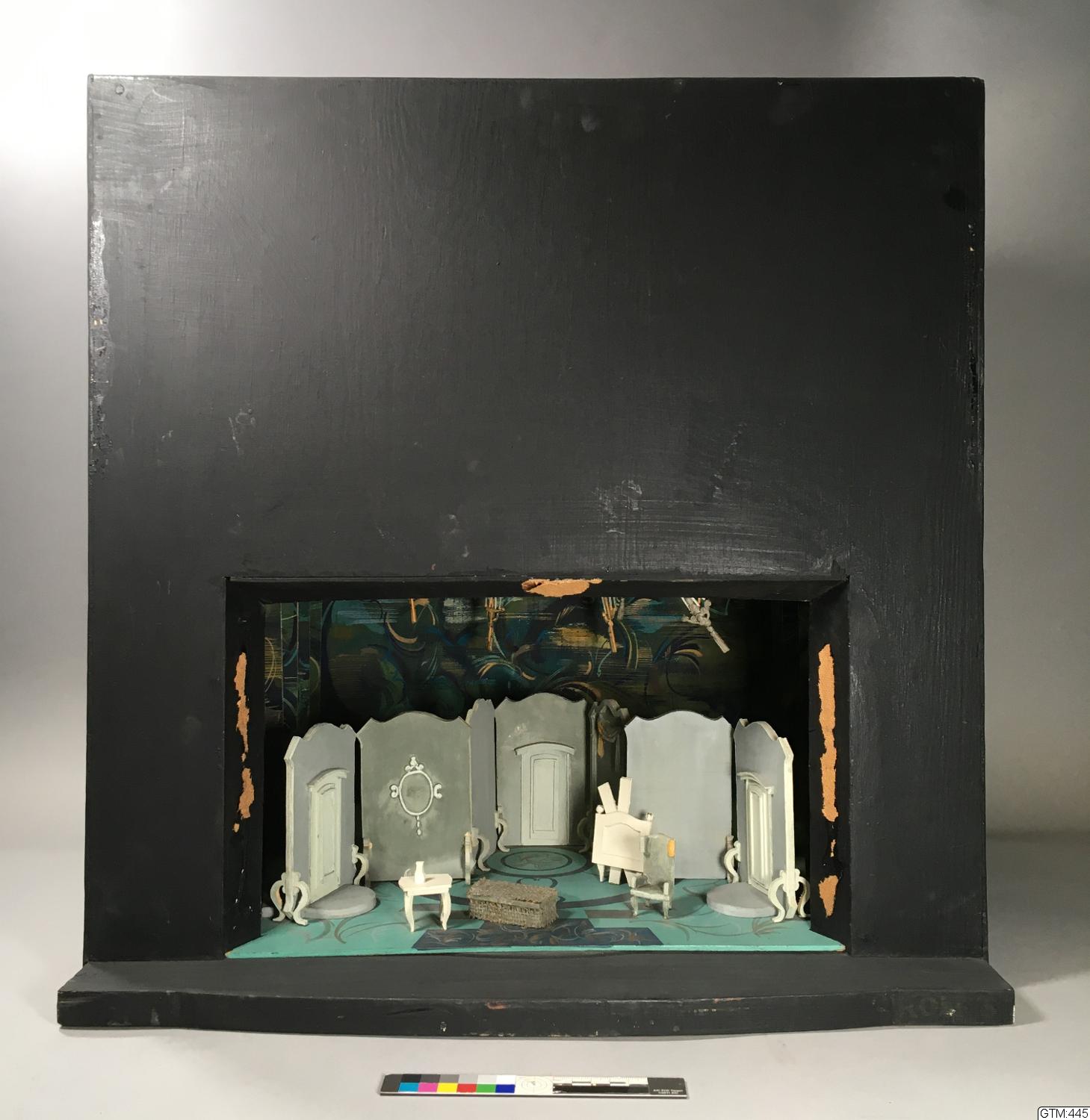 - Svart tittskåpmodell med rundad baksida, svart botten och proscenium, turkos scengolv med slingor och cirklar i blått, grått och brunbeige, ljusgrå dekor som längst ut på båda sidor har dörr, innanför på vänster sida en vägg med oval spegel, på höger sida en slät vägg med ett vitt staffli framför, mot mitten och bakgrunden ytterligare en vägg med dörr (väggarna gjorda som skärmar och har troligen kunnat vändas) mitt på scenen ett vitt bord, divan i grått och en fåtölj, fond och sex sättstycken på var sida är målade i blågrönt, grått och brunbeige, fem ljuskronor hänger ner från taket.