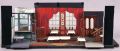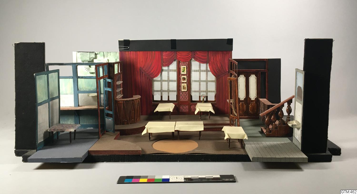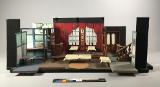 Svarta sidostycken, i mitten brunt golv med ljusare cirkel i mitten , tre bord i förgrunden, trappavsats mot fondväggen som har rosarött väggfält mellan två stora fönster med tyllgardiner och tunga röda gardinkappor vid sidorna, bardisk t v, två bord med vit duk framför fönstren, på vänster sida av scenen, blått golv, grönblå väggar, köksdisk med lucka in till kök, dörr t h in till restaurangen, på höger sida längst ut grå kakelgolv, på väggen tvättställ med spegel, längre in en brun trappa med räcke, i fonden brun dubbledörr, garderobdisk t h därom, dörr och öppna väggar in till restaurangen.; papper limmat på grundplattan av masonit i rummens resp. färger, ovanpå har dek delar och detaljer limmats fast.