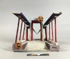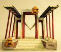 - Sammanhängande kolonner på båda sidor om breda trappsteg upp till en avsats med portaler, en stor i mitten, två mindre på var sida, två stora ansiktsmasker, en på vänster sida av trappategen, en t h uppe på stora portalen.