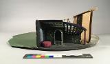 - Skåpet innehåller lös platta, med två scenbilder. Bild -a: scenbild i tittskåpet. -b: Fyra trappavsatser i grönt, sidorna har ljusgröna väggar och gråbruna väggfält, överst på avsatsen står gröna växter på vars ida, pelare i fonden, snedställt tak med rutmönster. -b: svart- och grönmönstrade väggar, t v en röd, rund puff, t h en bågformad öppning, från mitten snedställt tak i rutmönster.