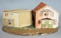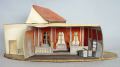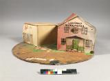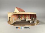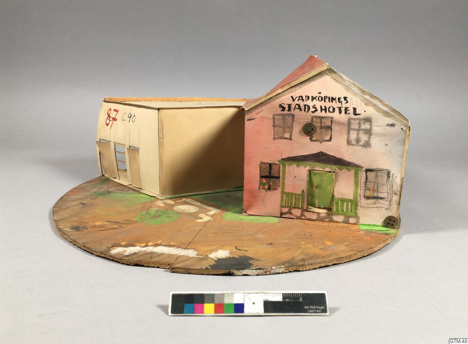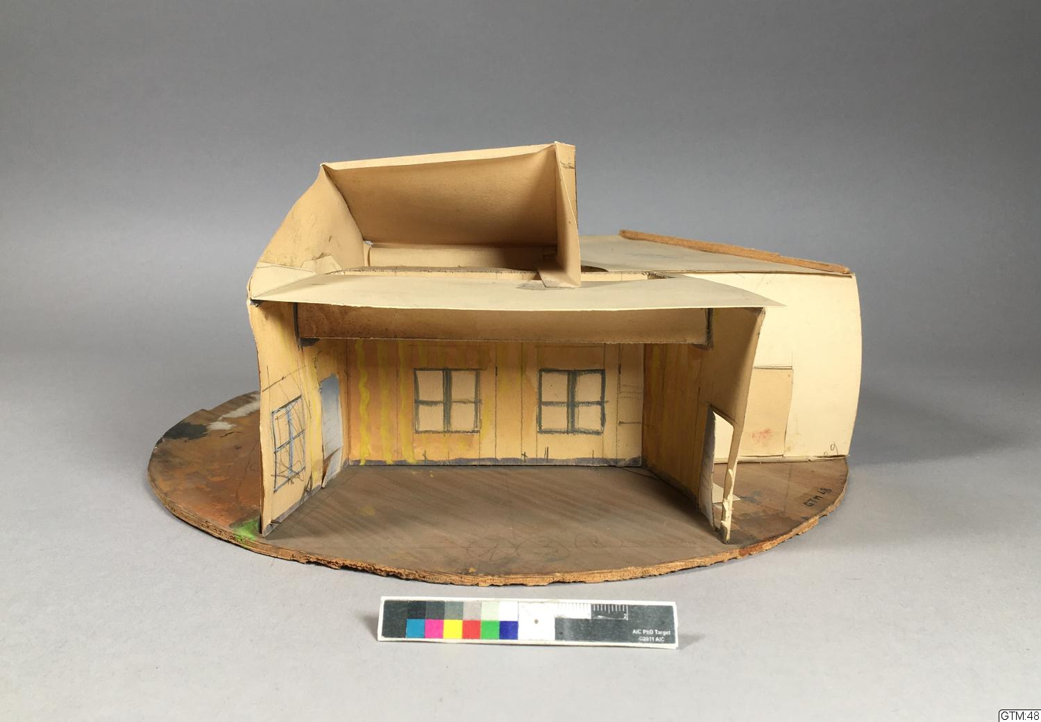 dek.delar i papper är limmade på den runda grundplattan i plywood.; _a: Exteriör av gavel med rosa fasad och tak, grönmålad verandraentré, t v på grundplattan målade antydningar till ytterligare en scenbild. _b: rum med gulrandig tapet och två fönster på fondväggen, en dörr på sidoväggen. _c: rum med röfmönstrade väggfält, grå paneler, en dörr på vänster sida, två dörrar på höger sida, mellan dem en disk och öppning i väggen, en avsats med räcke på båda sidor framför fondväggen, som har tre fönster med röd gardinuppsättning.