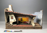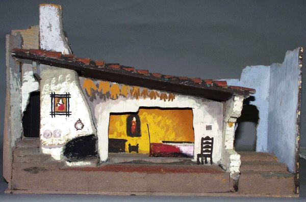 tunna träskivor och grova masonitskivor är utskurna och limmade på tunn träskiva (plywood); Snedtak med tegelpannor i framkanten, därunder ett rum med grova, vita väggar, t v en smal öppning i väggen med en svängd trappa som leder ner till rummet, vid trappan en stor öppen spis där murstocken går vidare genom taket så man ser skorstenen på ovansidan, i bakgrunden i en alkov med gul vägg, står en säng. T h om interiörväggen finns en exteriör med grå murvägg, tre trappavsatser leder ut mot en öppning i murens fond.