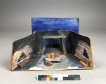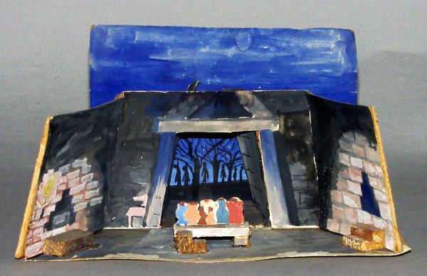 - Rum med mörka murade väggar, på sidorna grårosa fält med gluggar i muren, som har trappsteg framför, mittväggen har har en öppen djup portal med sluttande tröskel in mot rummet, genom portalen ser man den mörkblå fonden med konturer i svart av människor hängande i träd, mitt på scenen, framför portalen, finns ett podium (eller bord ?) med två trappsteg framför, på podiet tätt sittande människor i olika färger.