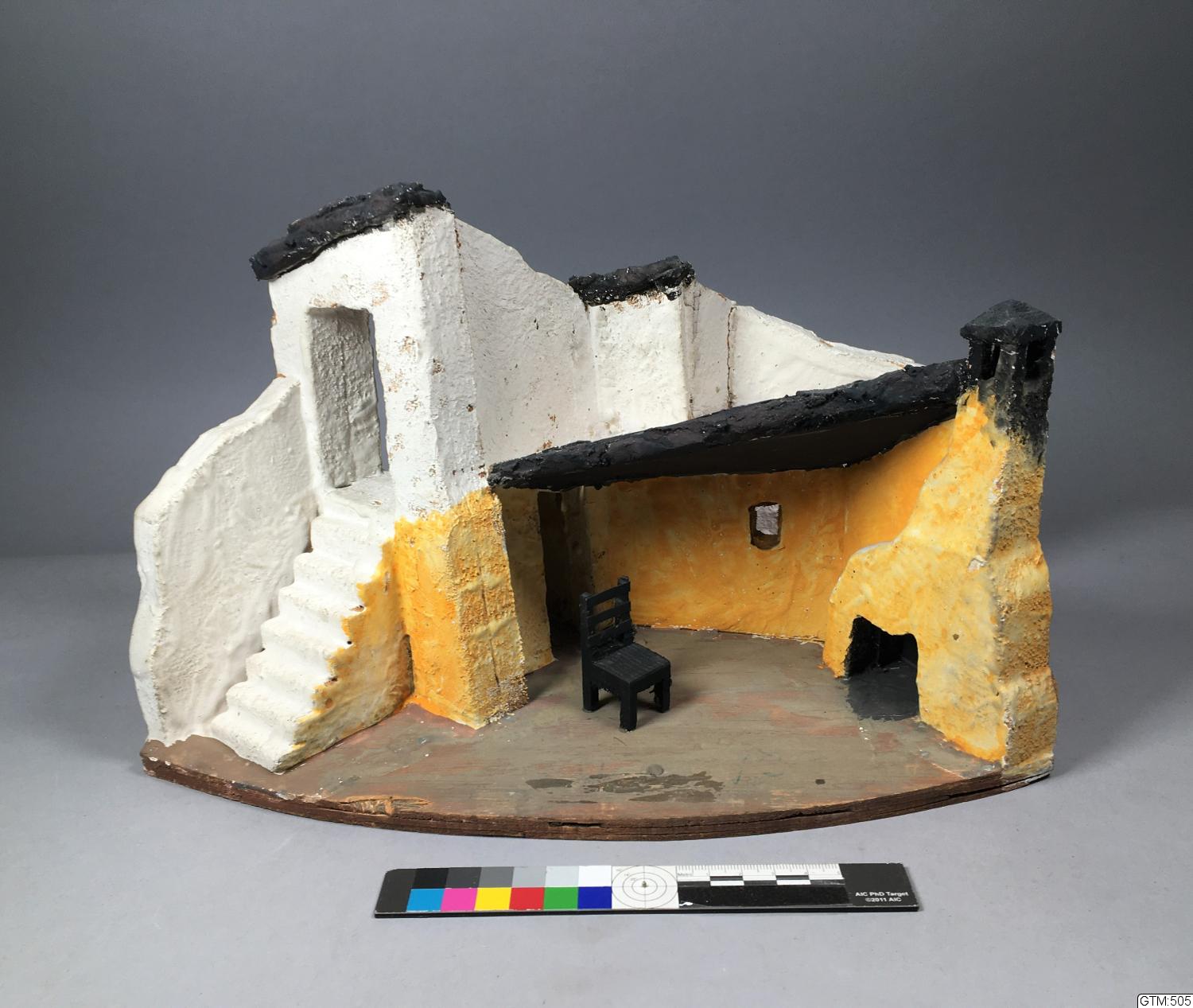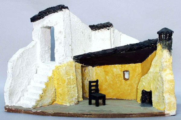 - På vänster sida en smal, brant trappa som går efter en vit murad vägg och leder upp till en portöppning i muren, murväggen leder vidare åt höger, framför, och under snedtak, ett rum med gula murade väggar med en dörröppning längst in i hörnet t h därom har väggen en fönsterglugg, längst ut th en eldstad med murstock och skorsten, en svart pinnstol mitt på golvet.
