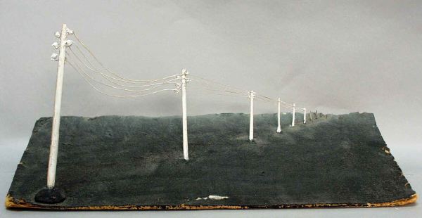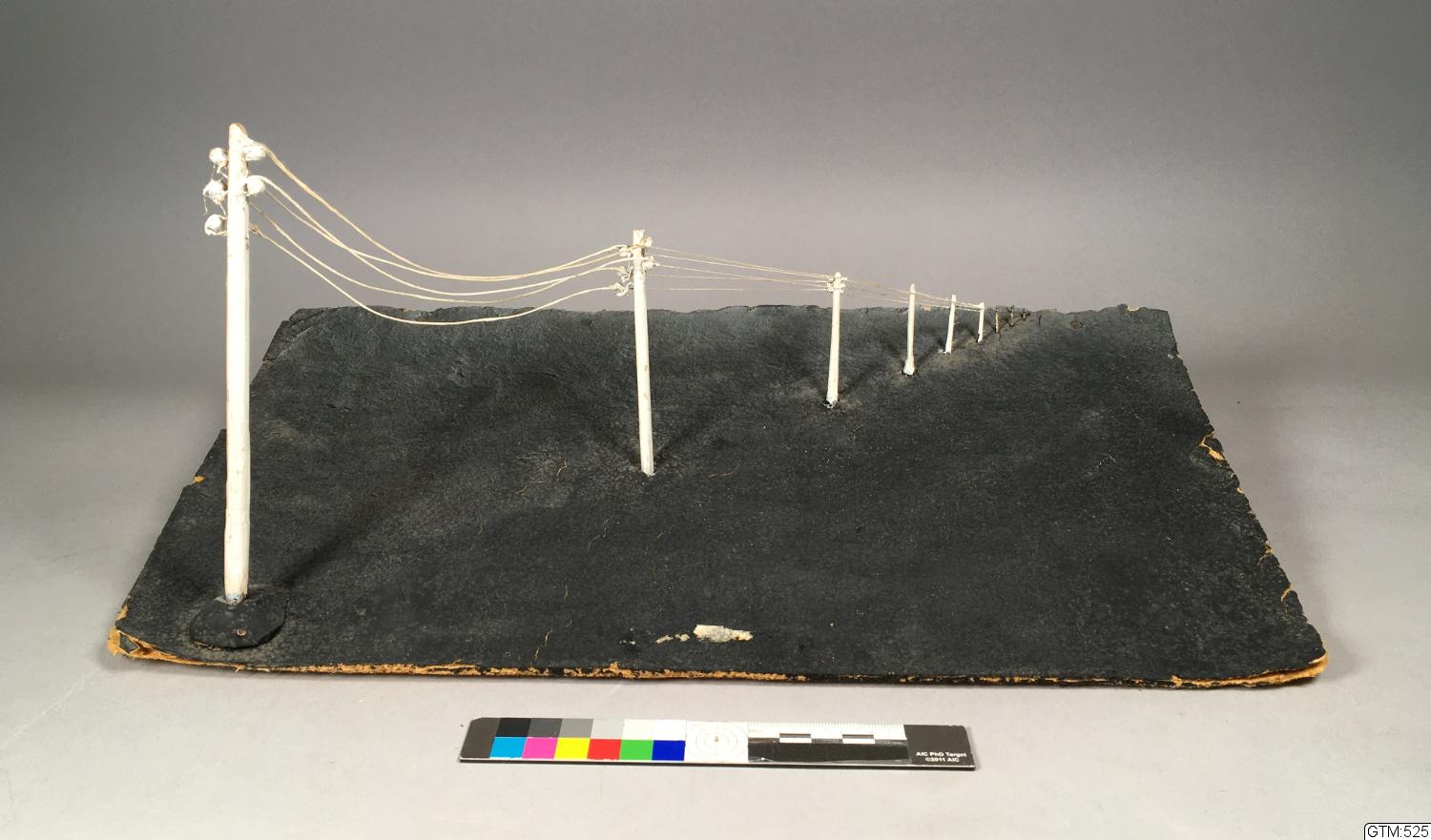 - Snedställt svart scengolv med vita telefonstolpar med trådar som går diagonalt från vänster framscen till höger i fonden.