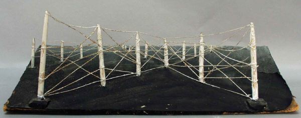 - Svart snedställt scengolv med korsande stängsel i vitt med pålar och trådar över hela scenen.