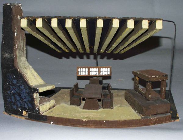 - delarna är limmade och spikade på masonitskiva, taket är monterat med hjälp av ståltråd fäst på scendelen t h och på murstocken t v, samt bak på plattan.