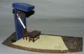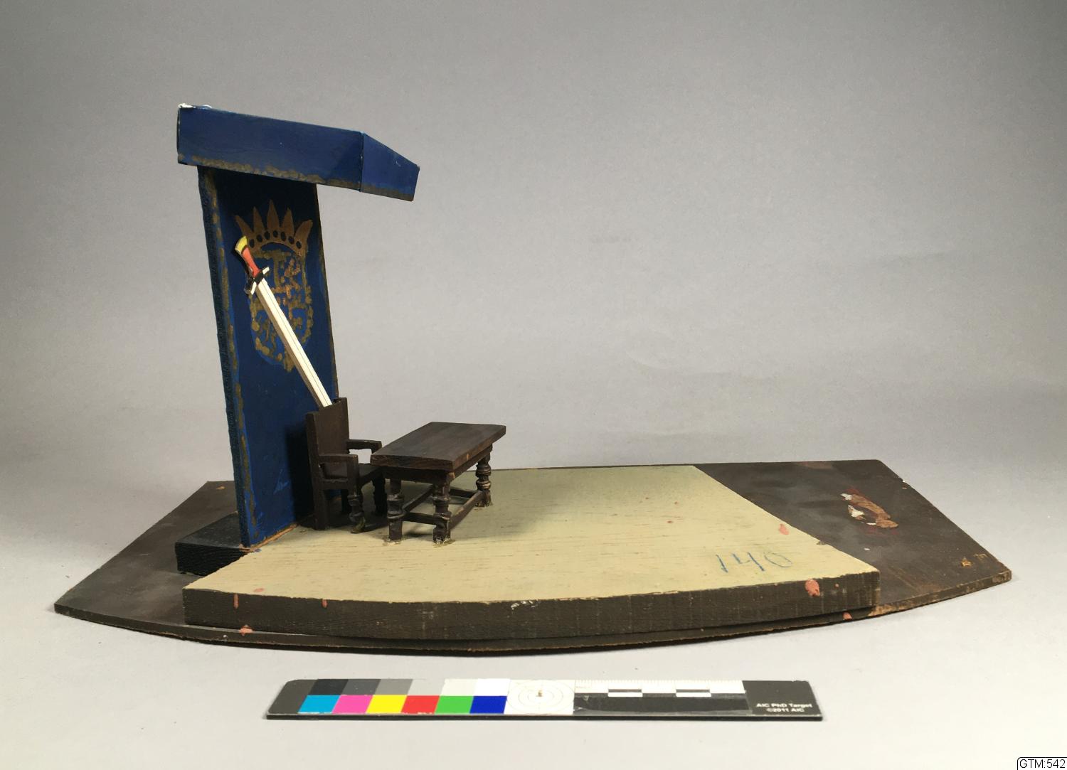 trädelar limmade på masonitskiva.; En avsats i grågrönt, på vänster sida om den en blå tron med himmel, vapensköld och ett snedlagt vitt svärd, framför tronen en brun karmstol och bord.