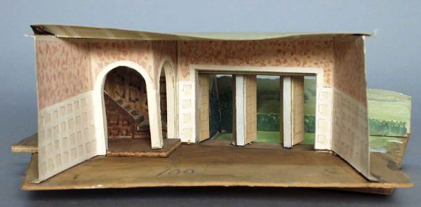 - Rum med rutiga paneler, rosamönstrad väggfält, kasett-tak, t v två bågformade öppningar mot en trappa i vinkel, fondväggen har öppna terrassdörrar, i bakgrunden ett grönt landskap.