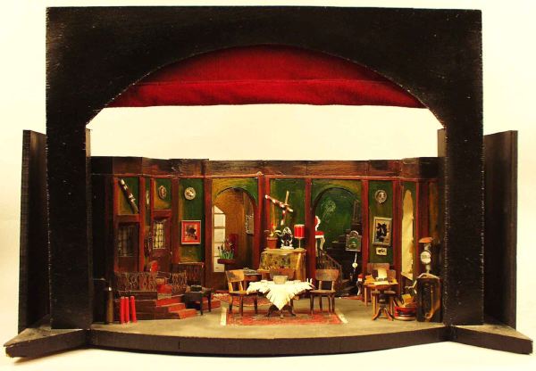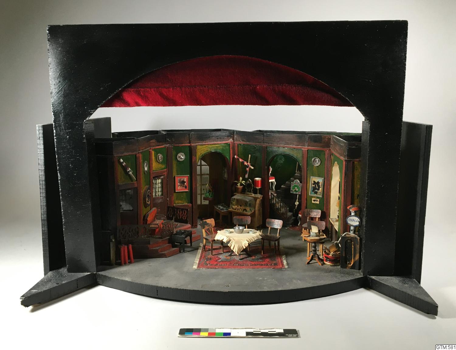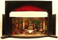 - Modellen gjord som tittskåp (utan lock och baksida) i svart med utskuren framscen, mycket detaljrik interiör av rum i vinklar, alkover och trappor, väggarna grönbruna, bruna paneler, på vänster sida med trappavsats och två dörrar som har glasrutor, i mitten t v bågformad öppning till rum innanför med stort fönster, i mitten t h också en bågformad öppning med trappuppgång i bakgrunden, på höger sida bågformat fönster, mycket möbler och väggdekorationer, mitt på scengolvet en rödmönstrad matta, bord med vit duk och tre stolar, svart golv, röd prosceniekappa.