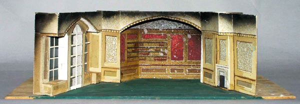 Ett rum med blågrå väggfält och ljusbruna paneler, på vänster sida två fönster i nisch och ett högt bågformat, i mitten av högra väggen finns en öppen spis, mittväggen har en bred bågformad öppning mot ett bakomvarande rum med bokhyllor och röda väggfält, grönt golv.; fönstren utskurna i c:a 2 cm tjocka träskivor, fönsterrutor av tyg limmade på baksidan, de övriga dek delarna av trä är spikade mot varandra på grundplattan, dek delar av papper delvis fastsatta med häftstift.