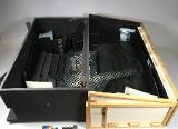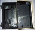 - båda halvorna är svartmålade i och utanpå gjorda av trä, den ena med en mindre öppning i de två ytterhörnen. den andra halvans tre sidor har ramar av trä som dekoren är limmad på, för övrigt är dek delar av kartong limmade på och mot varandra och mot de två halvornas botten. en liten lös del av trä och plast (ej fotogr).måtten på de två delarna är: bredd 58,5 höjd 25, djup 40,5. resp. bredd 64, höjd 26, djup 38,5.