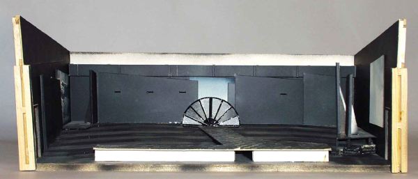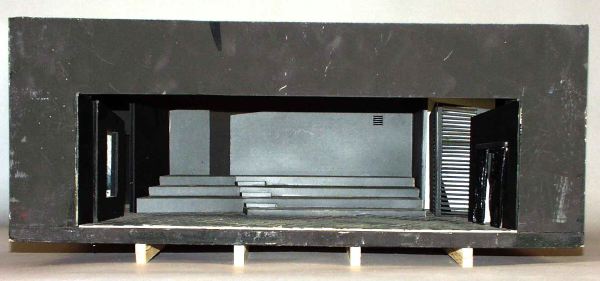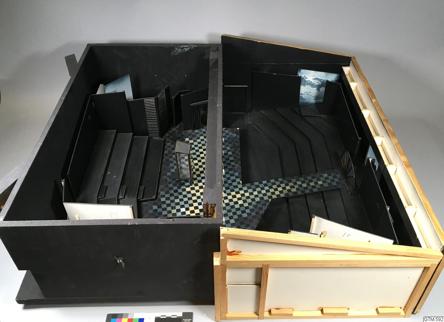 - Modellen är i två delar som går att sammanfoga och tillsammans utgör en scenbild med tillhörande sittplatser för publik monterad i svart låda utan lock. I mitten av modellen ett schackmönstrat golv i blågrått och svart med en brygga som går till ena kanten mot en solfjäderformad dekor, på sidorna skärmar i svart samt en del med molnmotiv mot blå botten, en dörröppning med draperi.