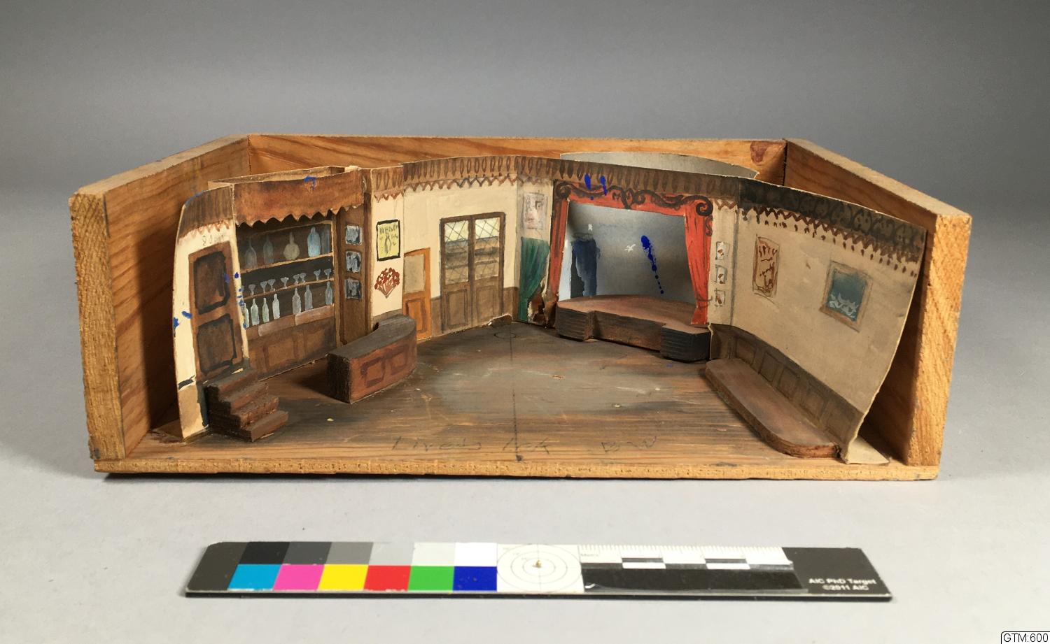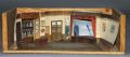 - i den omålade trälådan utan lock, är dek delarna i papper och trä limmade direkt på lådans brunmålade botten.