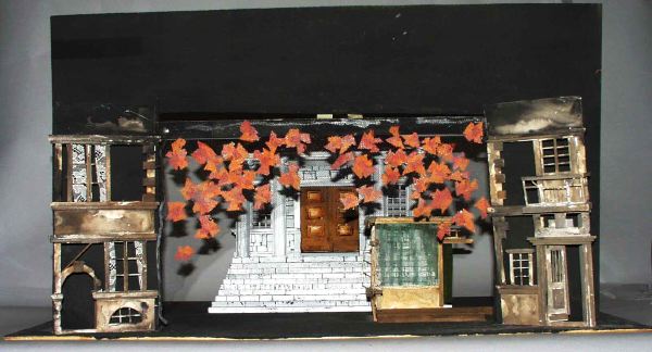 bild _a:Svart prosceniekappa, lövverk på nät inramar scenbilden i mitten. På var sida av scenbilden bruna husfasader i två våningar med fönster, dörr, portgång och balkong, på scengolvets högra sida en liten avsats med interiör som har genomskinlig vägg, ett fönster med spetsgardin, dörröppning med grönt draperi, i fonden breda trappsteg som leder upp till en avsats med två kolonner på var sida och som bär upp en trekantsgavel framför en grå fasad med fönster på var sida om en stor brun port. bild _b: portal i smide med text: MASKINFABRIKEN.; dek delar av trä, papper, ståltråd och nät är limmade och delvis spikade med nubb mot varandra och på grundplatta av trä (plywood), stål- och nätskonstruktion hoplödd mot varandra och på stativ av grov stålträd.