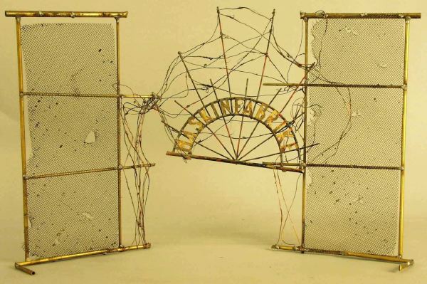 dek delar av trä, papper, ståltråd och nät är limmade och delvis spikade med nubb mot varandra och på grundplatta av trä (plywood), stål- och nätskonstruktion hoplödd mot varandra och på stativ av grov stålträd.