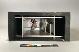 - skåpets sidor och tak är sammanfogade med tejp samt på grundplattan, allt av kartong, scenbildens dekor av kartong är ihoplimmad och vilar på stativ av tunna träskivor, figurerna av modell-lera, liten batteridriven belysning inkopplad.
