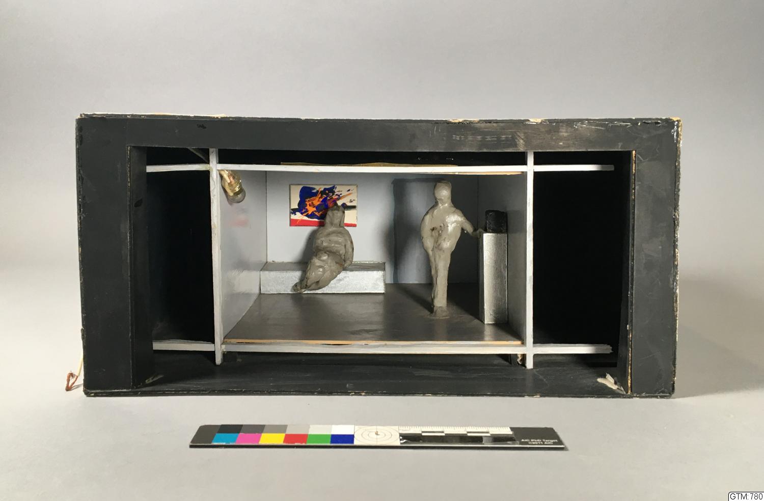 - Svart proscenium, scenbilden uppbyggd inuti tittskåpet. Ett fyrkantigt rum där väggar och tak är i ljusgrå lackfärg, golvet beige, en kvinnofigur (lös del) sitter på en divan i silver mot bakgrundsväggen med en tavla ovanför, på höger sidastår en mansfigur lutad mot en hög sockel av silver.