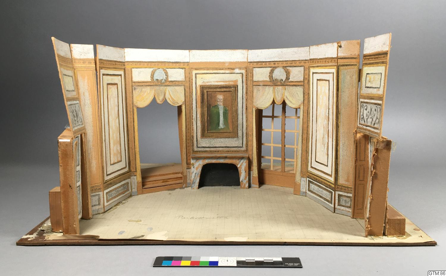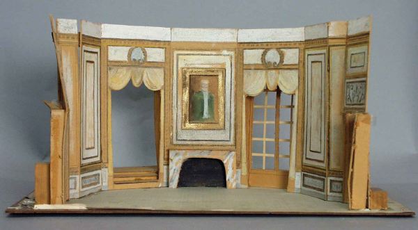 - Rum med ljusa väggfält i gult och vitt, grå och bruna paneler, ytterst på båda sidor dubbeldörrar, mittväggen har öppen spis med ett guldinramat porträtt ovanför, på vänster sida därom tre trappsteg upp genom en dörröppning med gul drapering, på höger sida om spisen ett högt fönster i nisch med gul drapering.