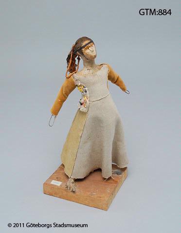 docka med kostym-modell. Föreställer Julias (spelad av Carina Boberg) klädsel i Stadsteaterns uppsättning av Romeo och Julia 1985.