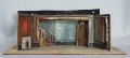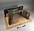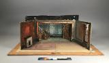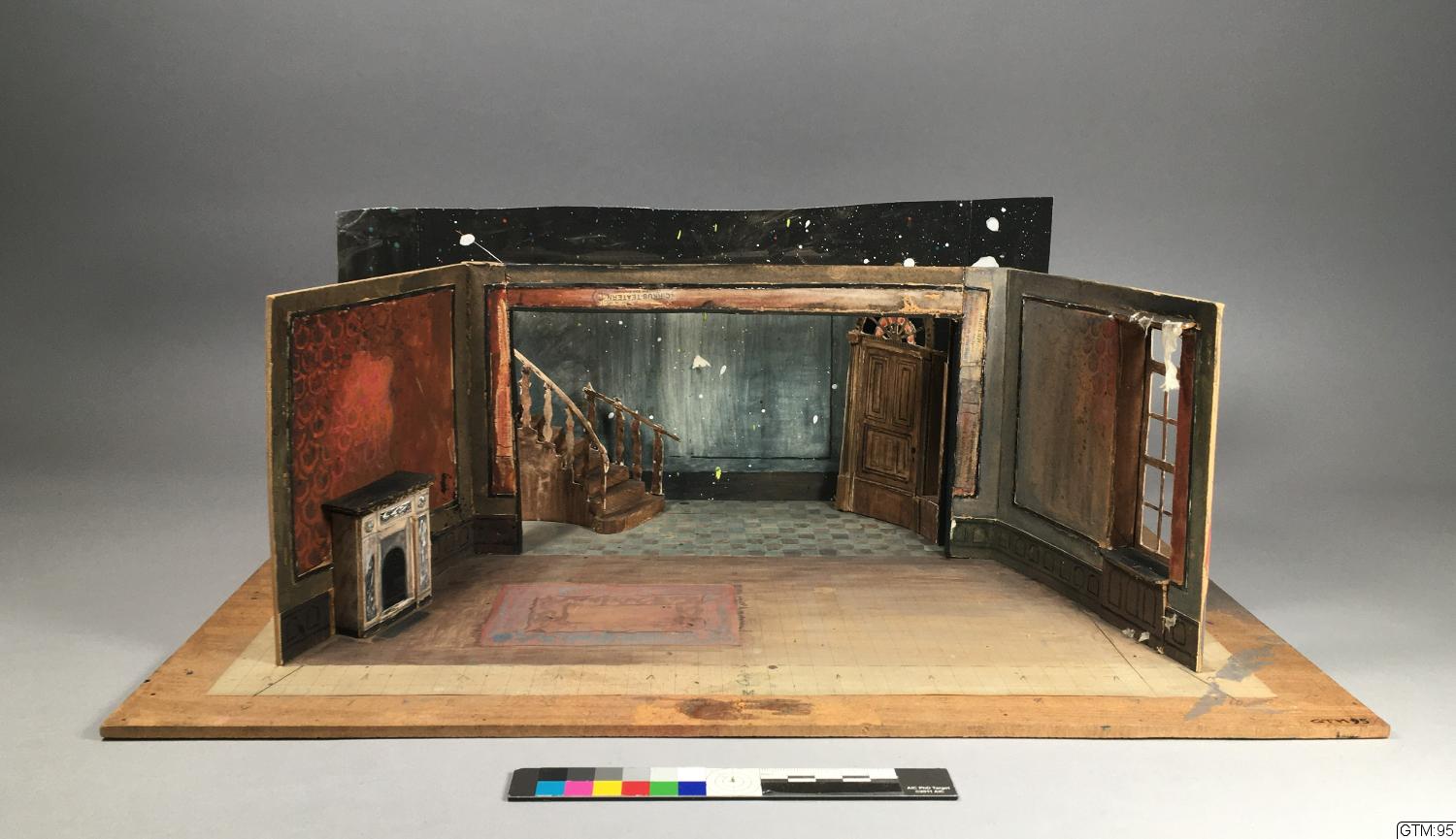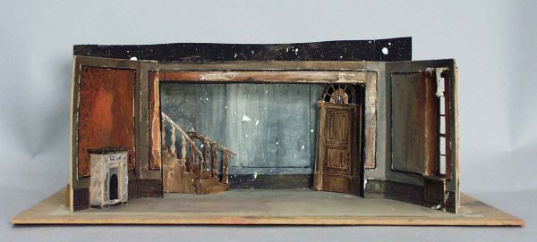 Rum med stor öppning i mitten, väggen till vänster har rödmönstrad tapet, öppen spis, bruna paneler, högra väggen är brunröd och har fönster i nisch, blårosa matta på golvet, rummet bakom öppningen i mitten har schackmönstrat golv i grått och brunt, till vänsater en svängd trappa med räcke till höger en brun dörr med solfjäderformad dekor över, fondväggen är svart med grått väggfält.; millimeterpapper limmat på grundplatta i masonit, dek delar av kartong är limmade ovanpå med hjälp av träklossar som stöd.