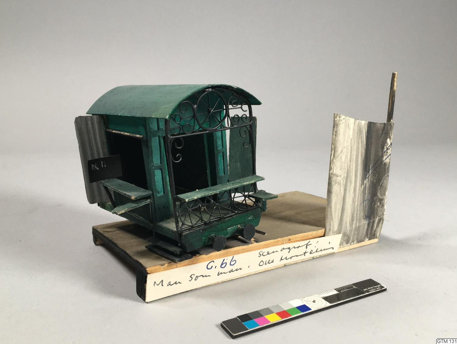- Detalj ur scenmodell av Olle Montelius. Dekoren av papper, trä och ståltråd monterade och limmade på tunn grundplatta av trä.