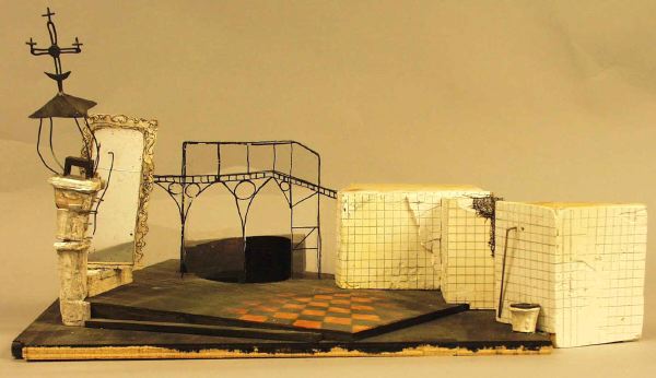 - svart scengolv med bred trappavsats ovanpå som är schackmönstrad i svart och orange, på vänster sida en pelare med svart litet korsförsett tak, en spegel i ram bakom, på höger sida vinklade vita kakelväggar, varav den främre har en toalettstol framför, i mitten en genomskinlig vägg över cirkelrund svart fördjupning (brunn?) i scengolvet.