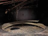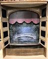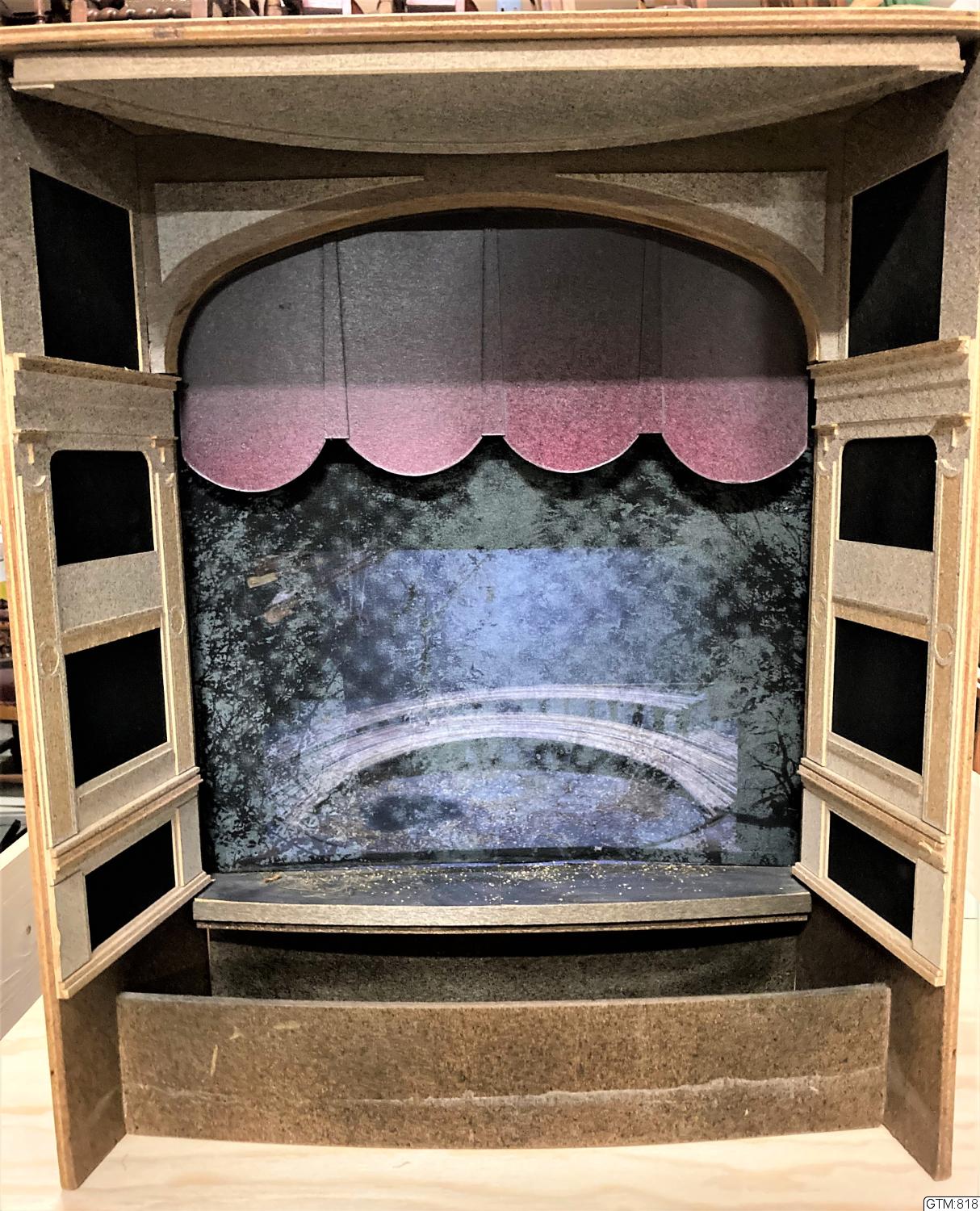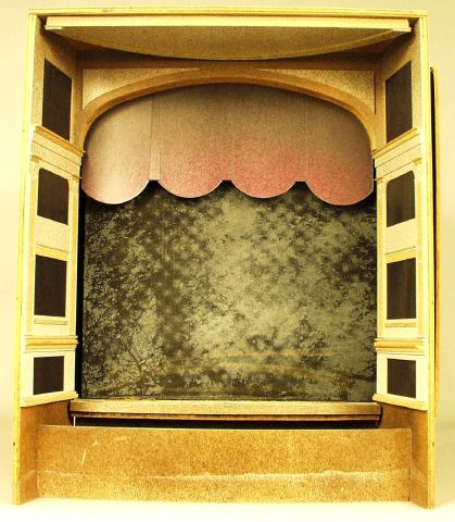 - Helt inbyggd tittskåpmodell i träfanér med proscenium som har svarta väggspeglar och gulgrå paneler, brunt orkesterdike, svart intäckning, röd prosceniekappa, svart scengolv med vridscensplatta (trol. gått att rotera)Bild _a. med svart slöjridå. Bild _b: öppen scenbild. Ovanpå vridscenen finns en uppbyggd halvcirkel i två sektioner, gjorda som bryggor av smala bräder, sågspån strödd över hela scengolvet, från taket hänger små kulor i trådar som regleras från tittskåpets ovansida.